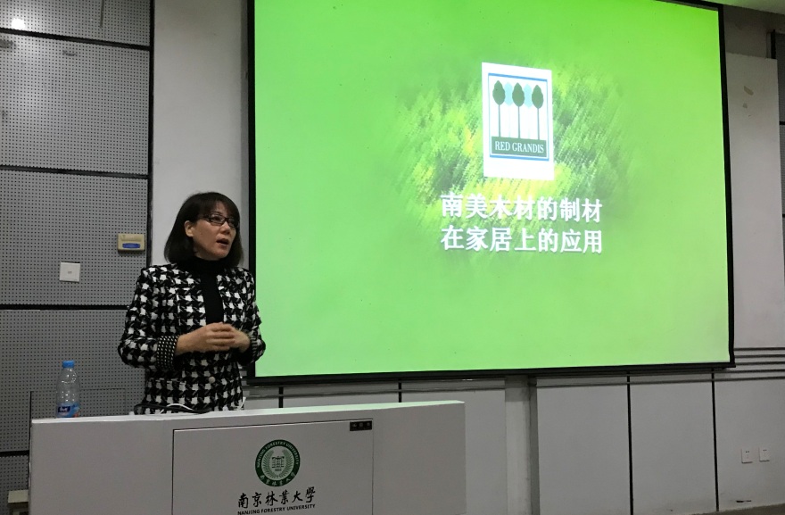 聘任仪式结束以后,俞兰芝总经理进行了题为 “南美洲可持续发展林业资源的林业管理、制材和广泛的应用”的专题讲座。讲座由吴智慧教授主持,相关课程老师和家居院工业设计(家具设计)专业制造方向的大四学生和产品设计专业大三学生共120余人参加本次活动。