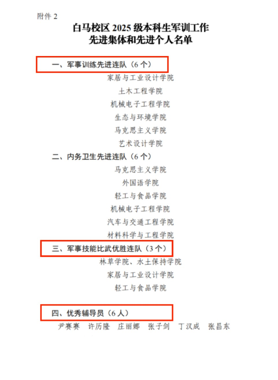 9月28日,2025级本科生军训落下帷幕。经过16天高标准、严要求的军事化训练,家居院2025级新生焕发出昂扬向上的精神风貌。在此次新生军训工作中,我院获白马校区军事训练先进连队、军事技能比武优胜连队荣誉,2025级新生辅导员尹赛赛获“军训优秀辅导员”荣誉称号;获淮安校区军事训练先进连队荣誉。
