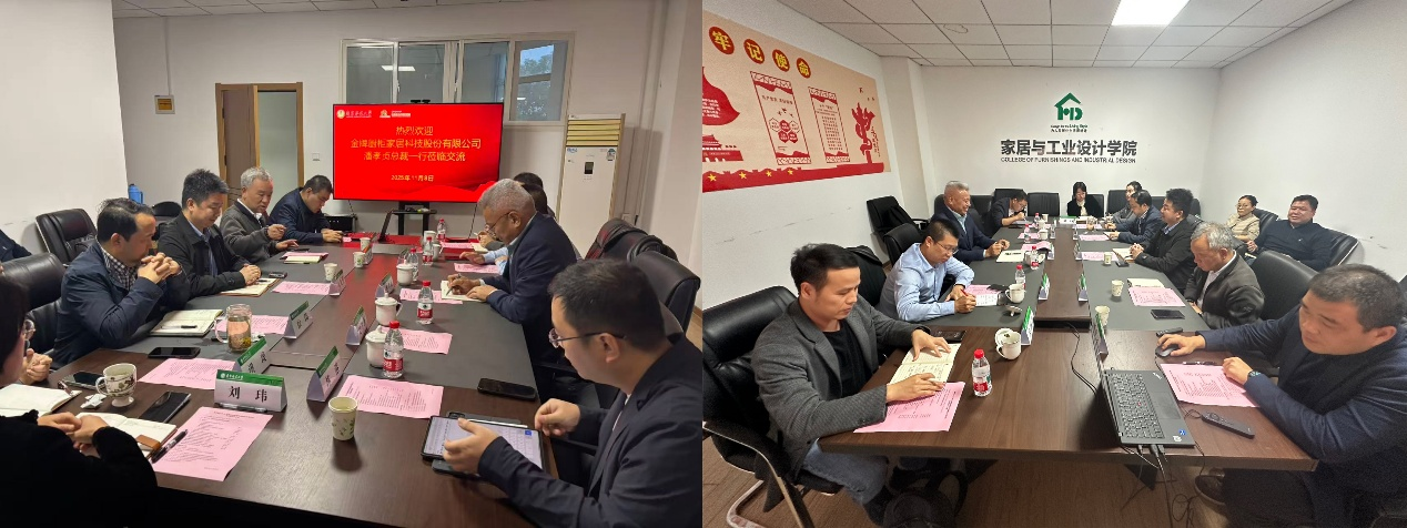 2025年11月8日下午,南京林业大学家居与工业设计学院与金牌厨柜家居科技股份有限公司在家居院第四会议室举行合作交流会议。出席会议人员有:金牌家居总裁潘孝贞、首席数字官张九兵,厦门鲲鹭物联信息技术有限公司董事长任昱衡,点金研究院院长吴阿伟、助理林港,南京林业大学家居院党委书记朱剑刚、院长徐伟、副书记兼副院长洪琰、副院长赵中元、副院长刘玮,智造系吴智慧教授、熊先青教授、陈红等。