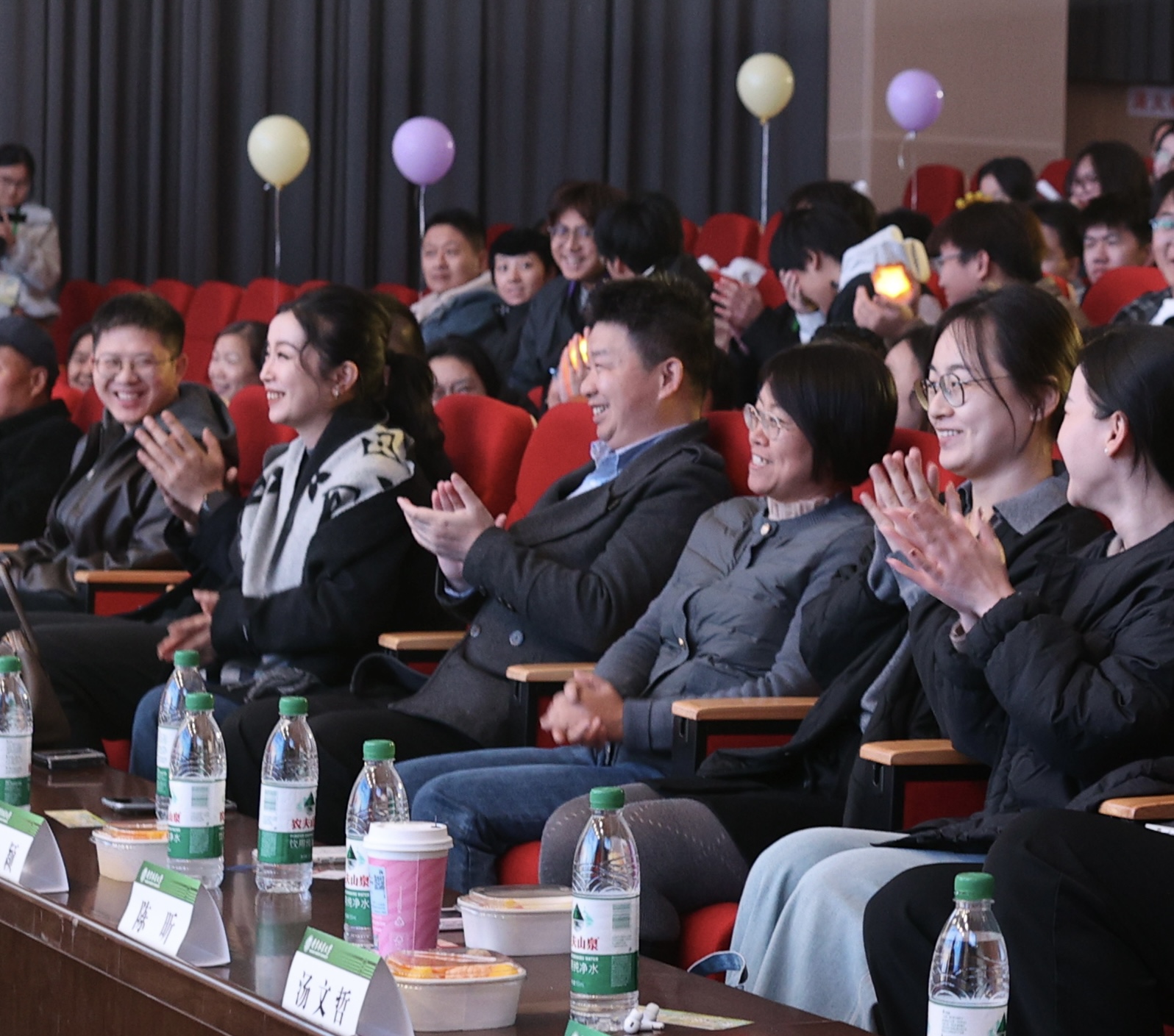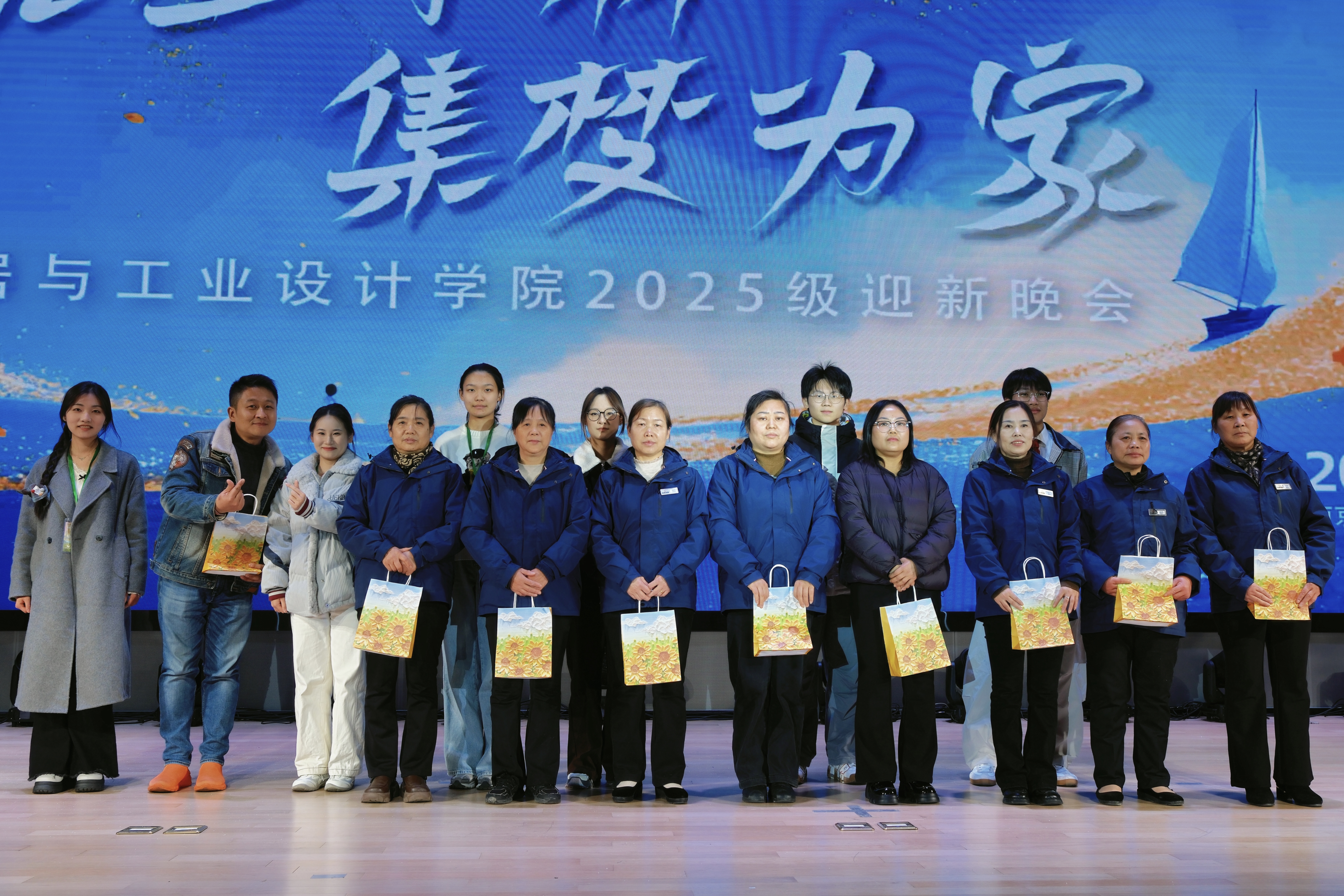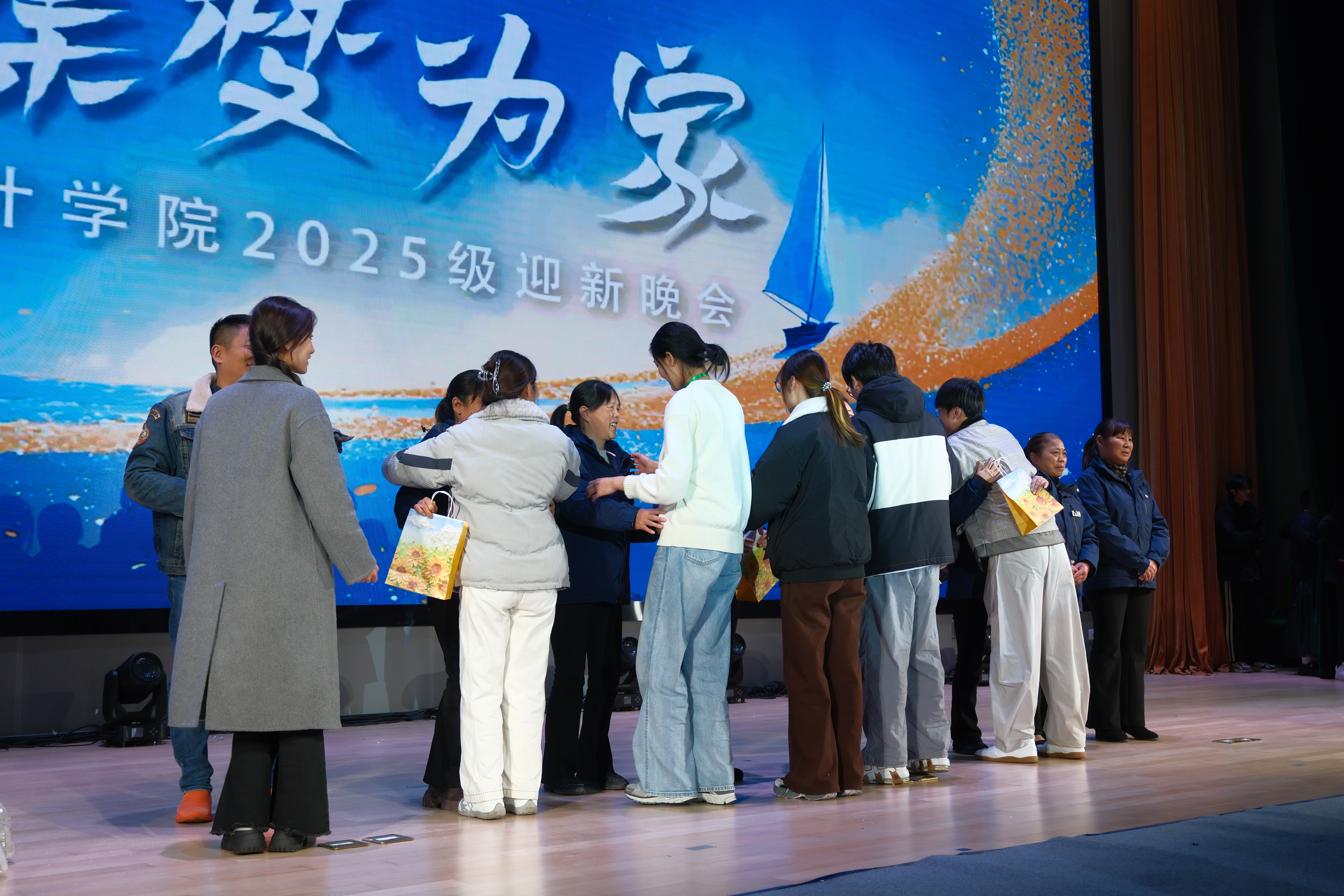 三楼食堂朱经理惊喜“跨界”,献唱《朋友》,并与观众亲切互动,传递出“相亲相伴如一家”的温暖愿景,引发全场共鸣。随后,一直默默付出的后勤与宿管人员被邀请上台,回迁本部的大二学生代表向他们送上暖冬礼物,感谢他们一年来的陪伴与守护,为晚会注入了真挚的温情。