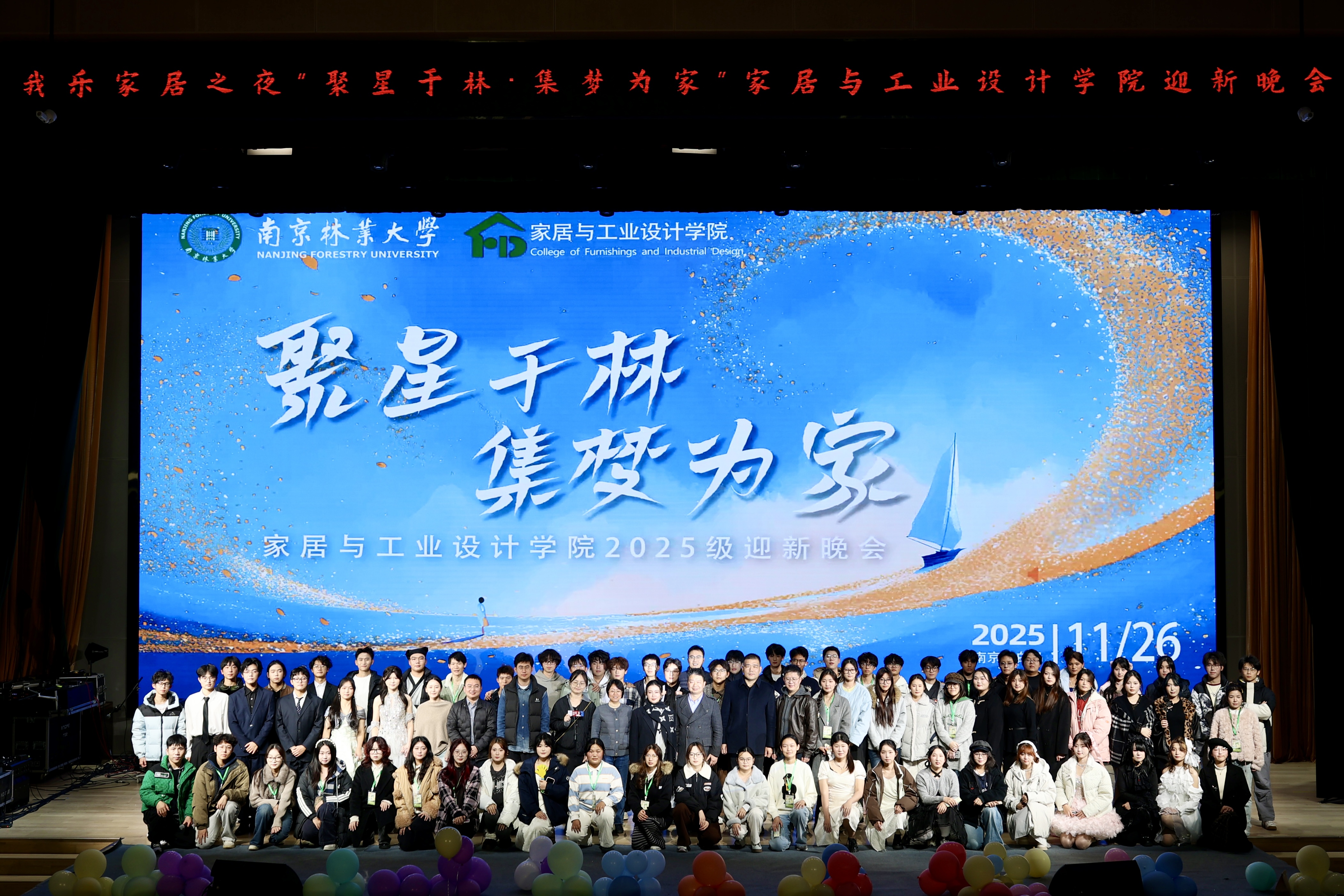 灯火璀璨映初心,青春聚力谱新篇。11月26日晚,我乐家居之夜“聚星于林 集梦为家”家居与工业设计学院2025级迎新晚会在白马校区6111报告厅圆满举行。学院党委书记朱剑刚,党委副书记兼副院长洪琰,副院长刘玮、赵中元,南京我乐家居股份有公司招聘经理魏颖,辅导员代表、全体新生班主任和2025级本科生共同参与。晚会还邀请了为师生提供周到保障的后勤服务人员,一同见证属于2025级家居学子的青春华章。