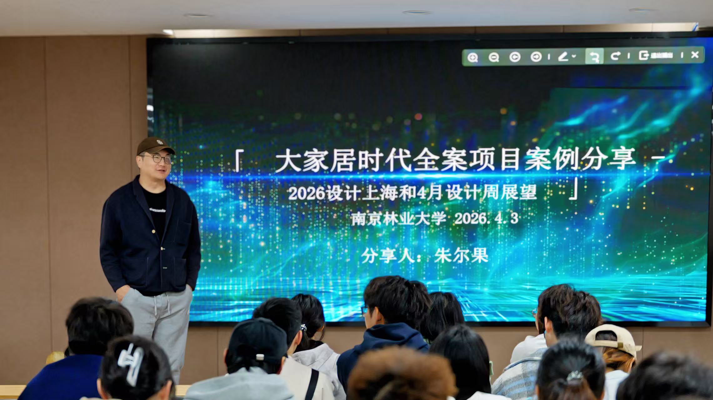 本次讲座由南京林业大学家居与工业设计学院周橙旻教授主持。活动伊始,翰木汇设计平台创始人、Erguo Studio设计总监朱尔果带来《大家居时代全案项目案例分享——2026设计上海和4月设计周展望》主题分享。朱尔果先生以2026设计上海和广州设计周的3个实操项目案例为核心脉络,深度解读了大家居时代下全案设计的核心价值,明确其本质是生活方式与美学逻辑的系统表达,打破了传统设计碎片化的局限。